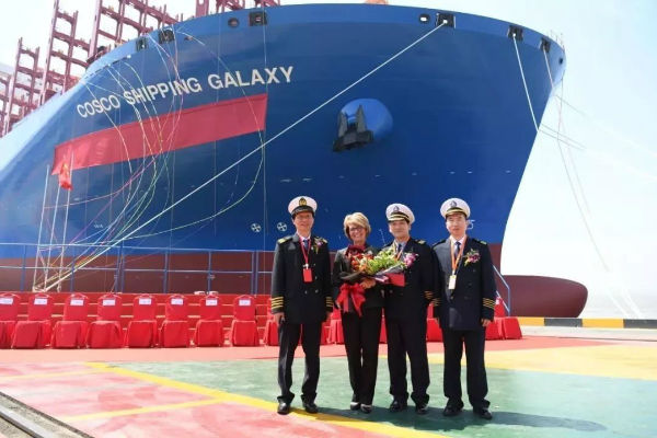 4月18日,中远海运集运第三艘21000TEU超大型集装箱船“中远海运银河”轮命名仪式在江南造船(集团)有限责任公司码头举行。来自美国